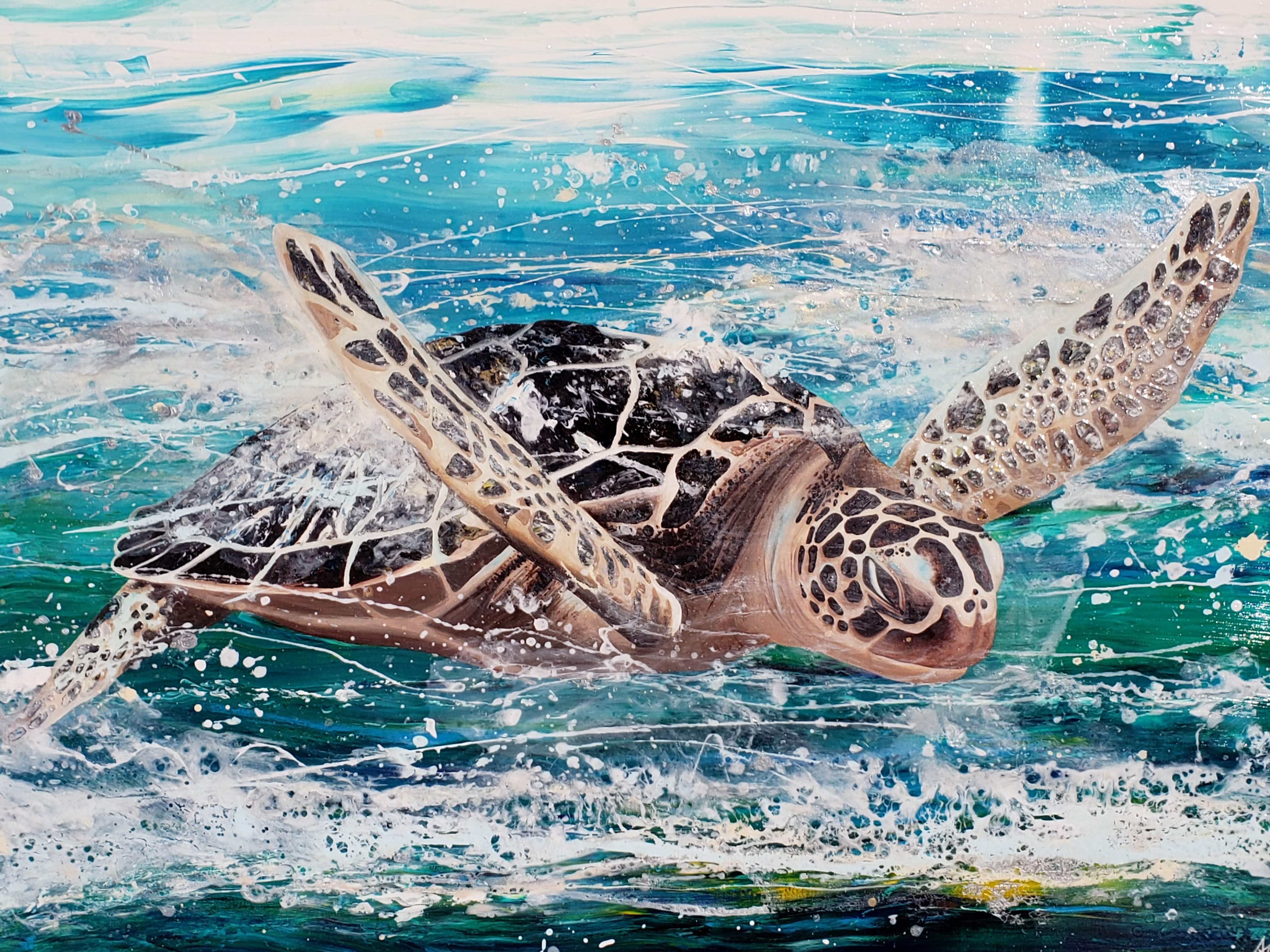Bold color, layered texture, and movement. I blend controlled brushwork with fluid techniques to create pieces that feel alive—sometimes pairing a fluid base with detailed subjects for contrast.