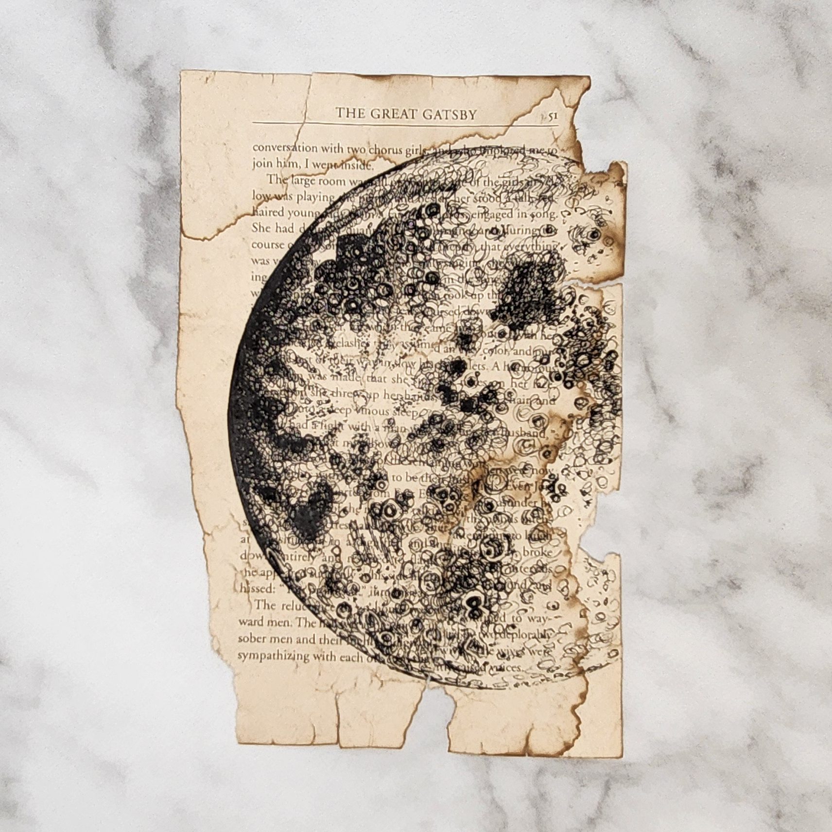 Illustrations drawn over aged book pages or music sheets. The history in the paper shows through the linework, giving each original a layered story. Due to the unique substrates, these are originals only.