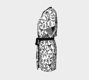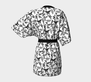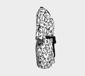 Wrap yourself in elegance with this pure silk kimono, featuring the Black Butterfly print, drawn in Calgary by artist Alexandria (madebyalexandria.com). Inspired by specimen-style arrangements of butterflies — detailed, balanced, and timeless — the artwork finds new life in flowing silk, transforming fine illustration into wearable art.